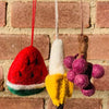 Small fruit-themed ornaments in the shape of a watermelon slice, peeled banana, and grape bunch. Perfect for a fruitful tree!