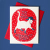This fancy-free cowboy cat is booted up and ready to strut around on their birthday. Risograph printed in bright red and federal blue. A2 card, blank inside Contrast envelope Risograph printed with eco-friendly, vegetable-based ink 100lb, FSC-Certified, 100% recycled paper in an off-white fiber-fleck stock