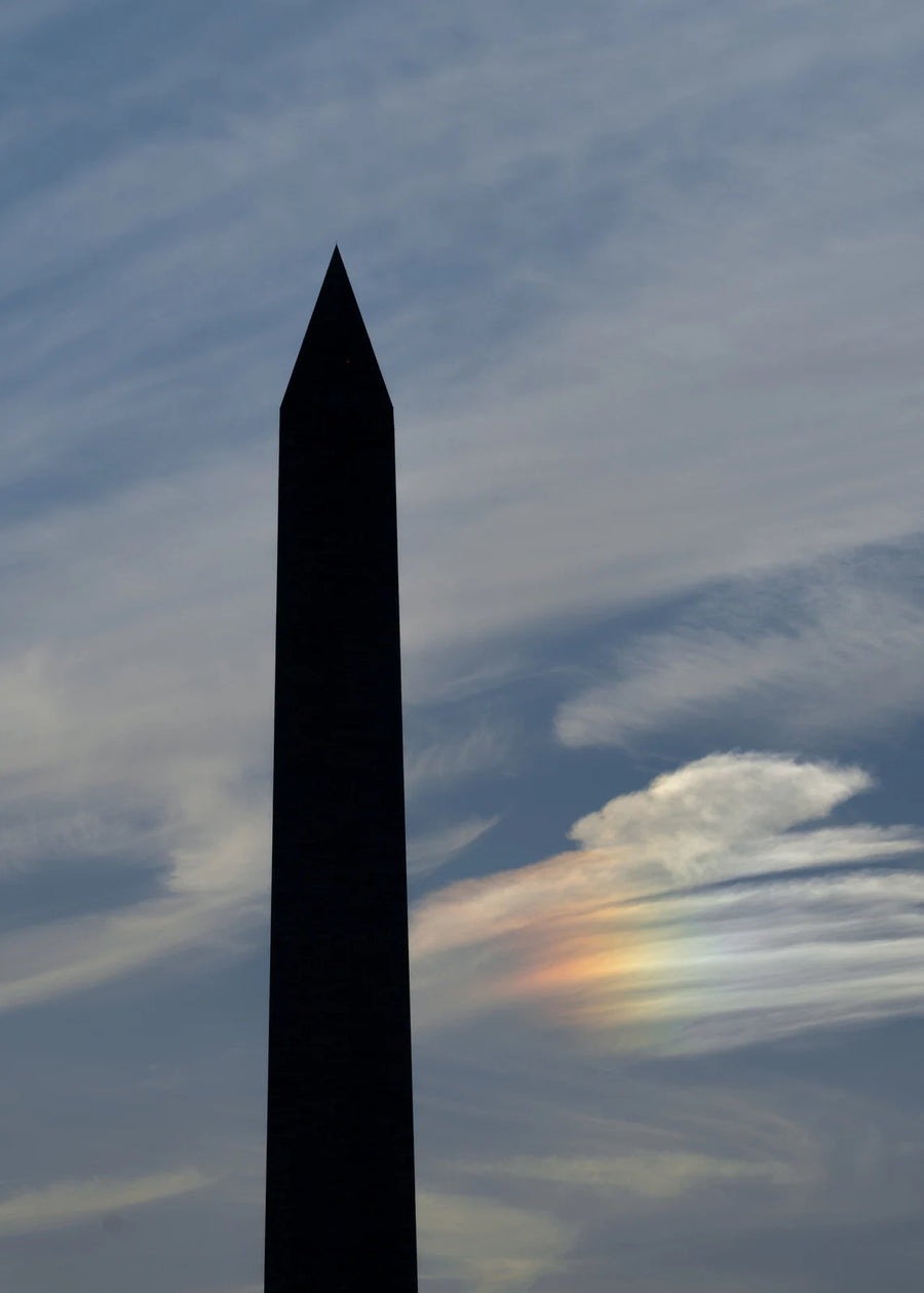 Professional archival photographic PRINT ONLY of a small rainbow next to a silhouette of the Washington Monument. Printed on lustre paper